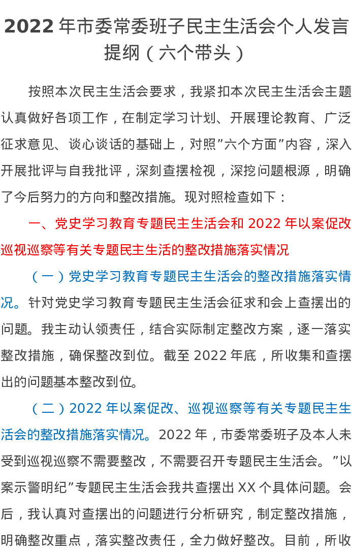 2022年市委常委班子民主生活会个人发言提纲(六个带头)5811字