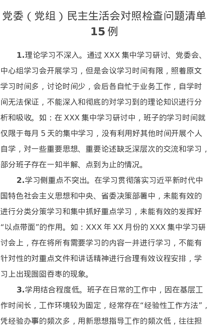 党委(党组)民主生活会对照检查问题清单15例