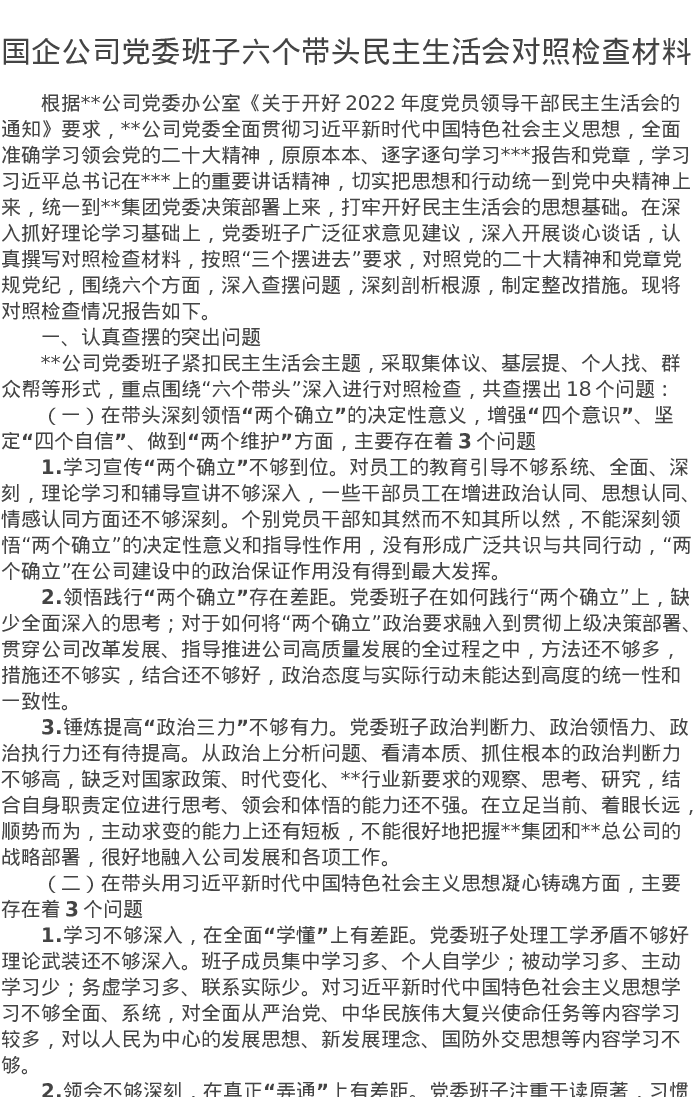 国企公司党委班子六个带头民主生活会对照检查材料 5841字