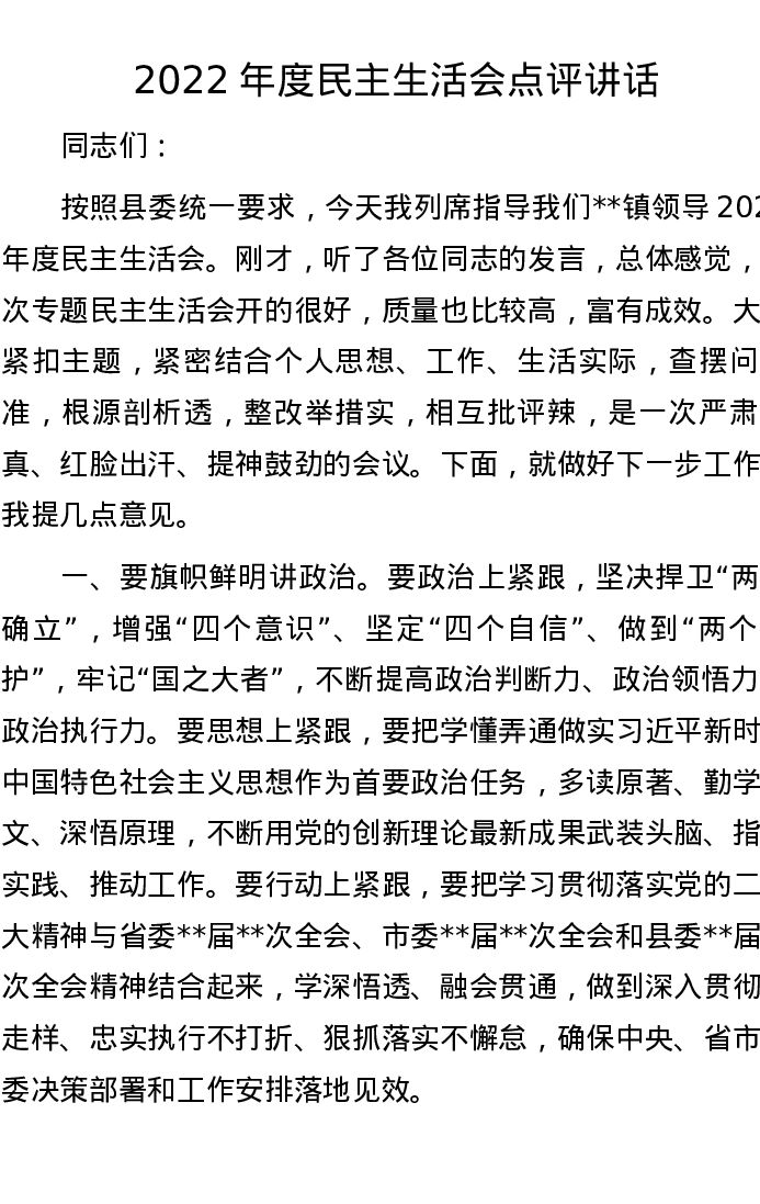 点评讲话:2022年度民主生活会点评讲话 1133字