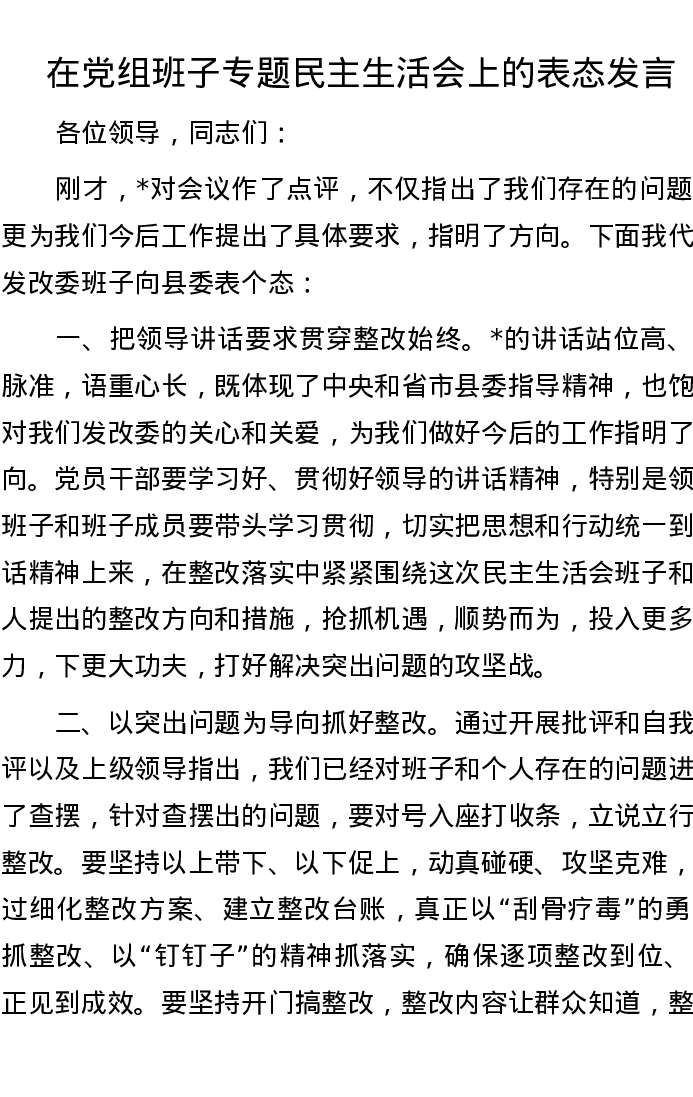 表态发言:在党组班子专题民主生活会上的表态发言 956字