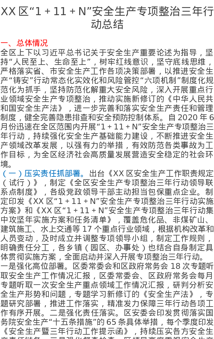 XX区“1+11+N”安全生产专项整治三年行动总结