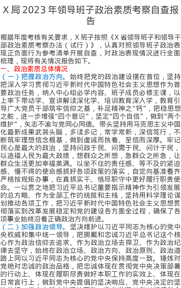 X局2023年领导班子政治素质考察自查报告
