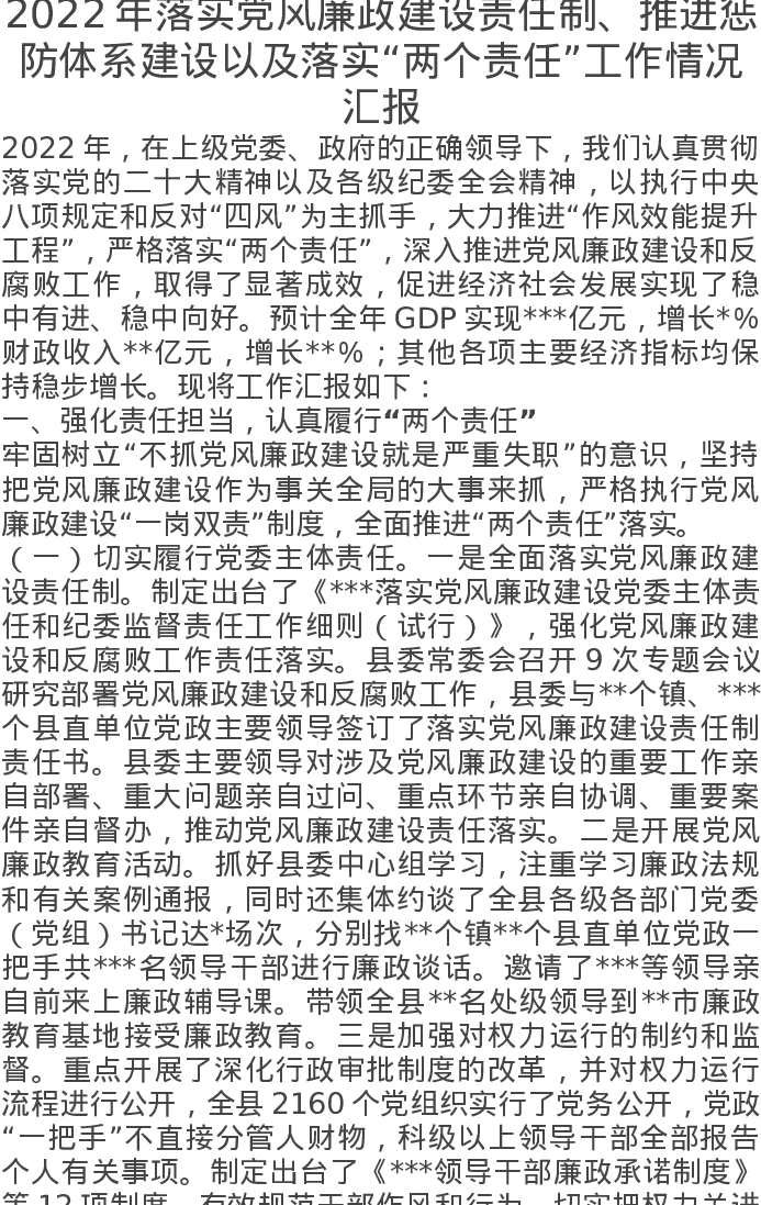 2022年落实党风廉政建设责任制、推进惩防体系建设以及落实“两个责任”工作情况汇报