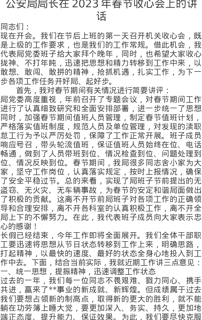 公安局局长在2023年春节收心会上的讲话