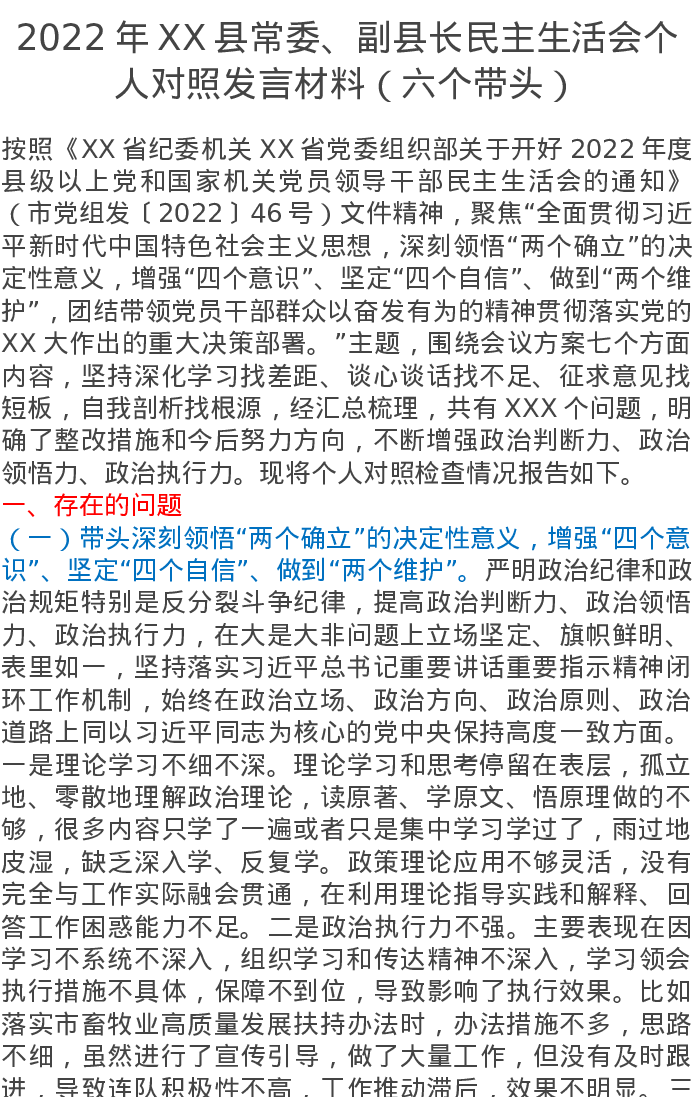 2022年XX县常委、副县长民主生活会个人对照发言材料(六个带头)4701字