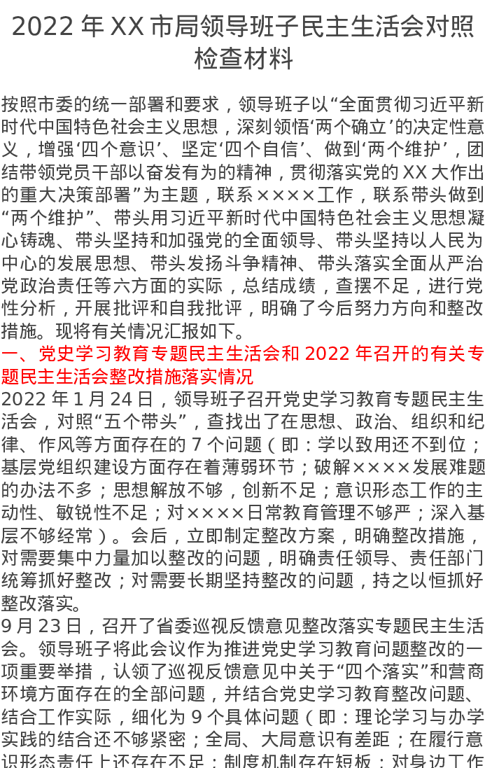 2022年XX市局领导班子民主生活会对照检查材料(六个带头)5603字