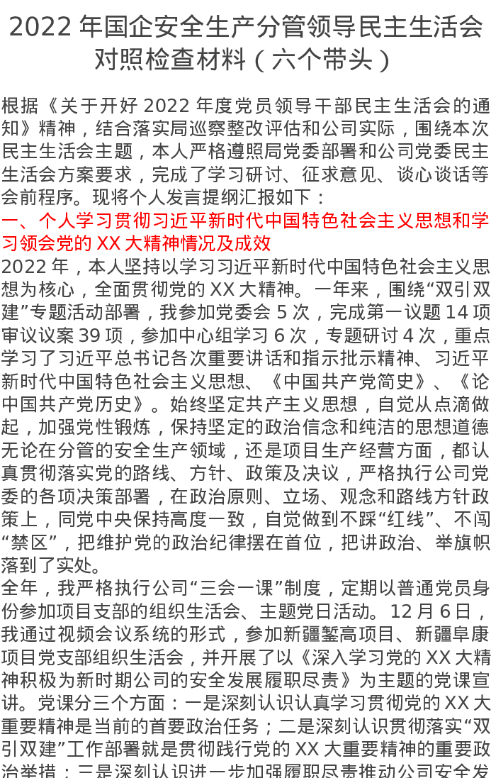 2022年国企安全生产分管领导民主生活会对照检查材料(六个带头)6754字
