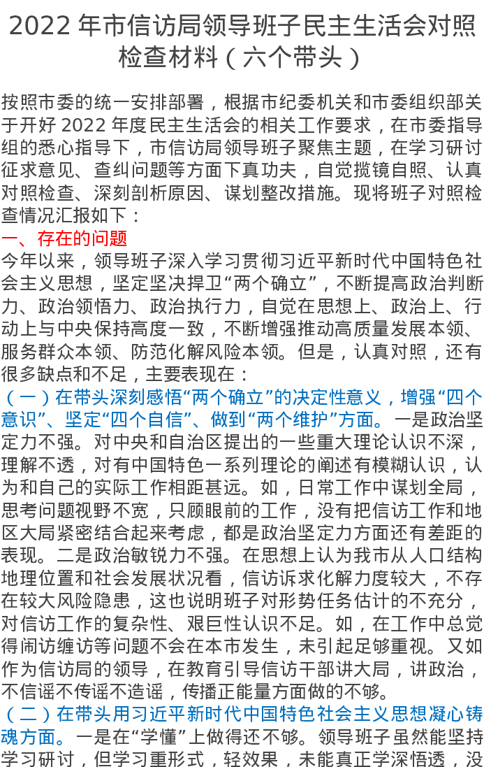 2022年市信访局领导班子民主生活会对照检查材料(六个带头)