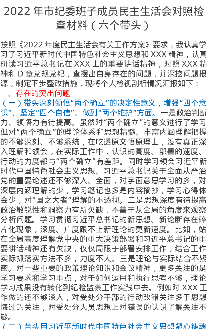 2022年市纪委班子成员民主生活会对照检查材料(六个带头)