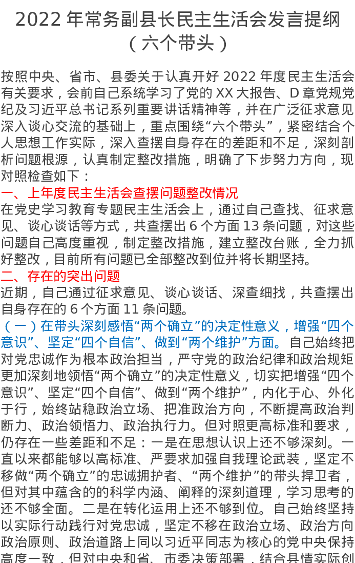 2022年常务副县长民主生活会发言提纲(六个带头)