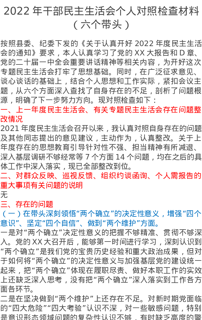 2022年干部民主生活会个人对照检查材料(六个带头)3346字
