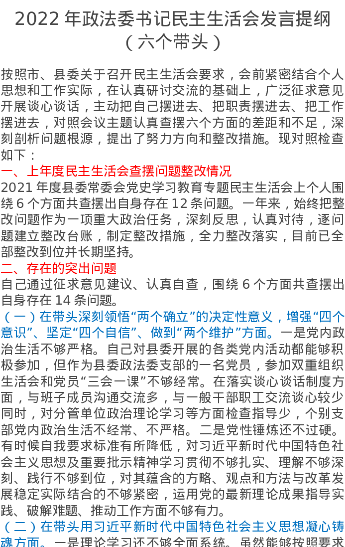 2022年政法委书记民主生活会发言提纲(六个带头)
