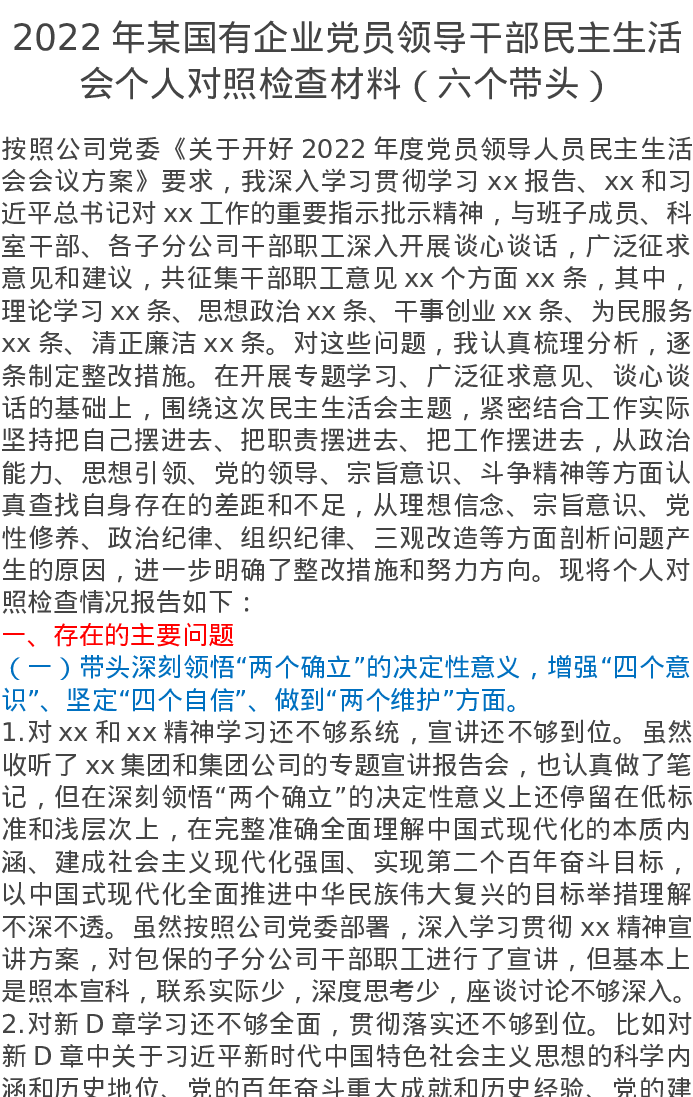 2022年某国企干部民主生活会个人对照检查材料(六个带头)6967字