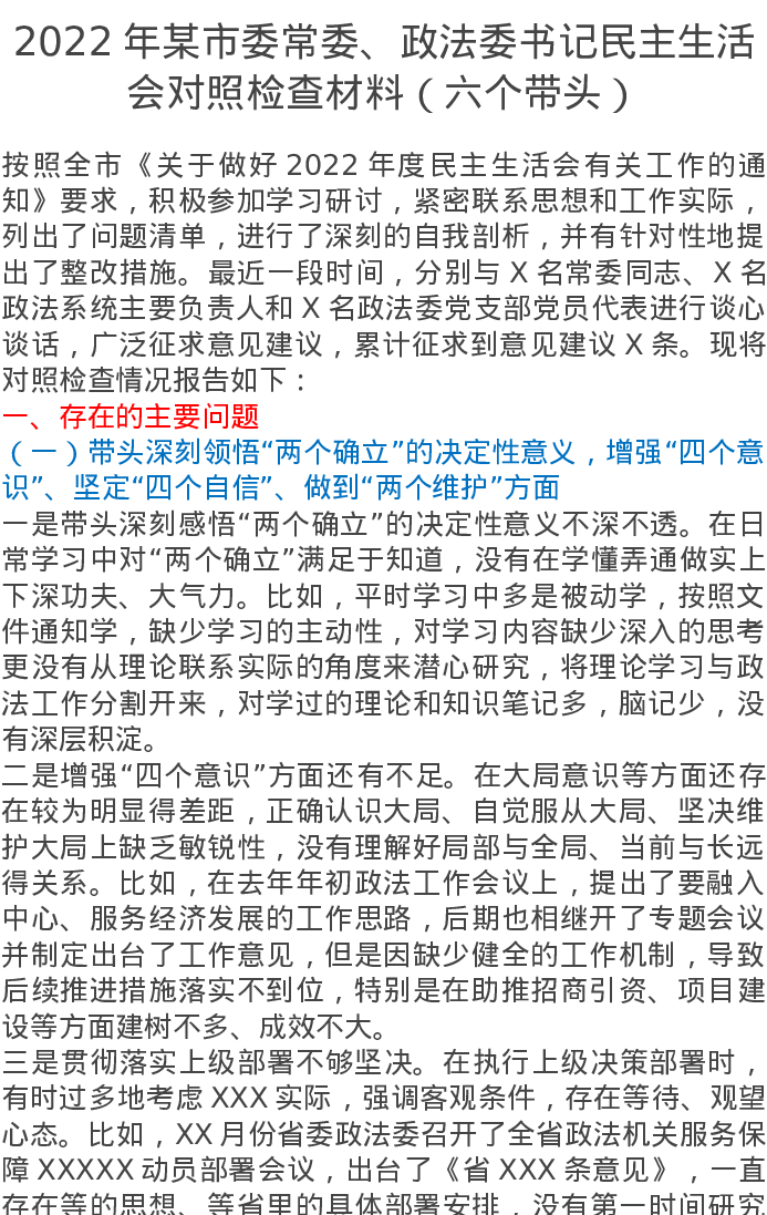 2022年某市委常委、政法委书记民主生活会对照检查材料(六个带头)5267字