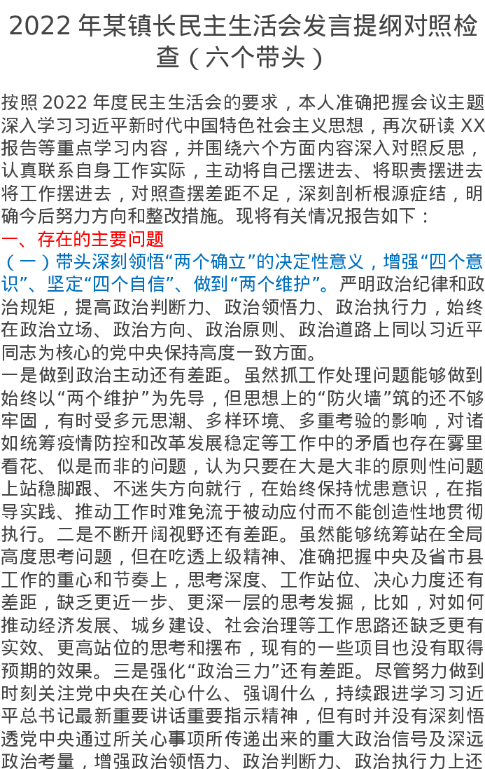 2022年某镇长民主生活会发言提纲对照检查(六个带头)