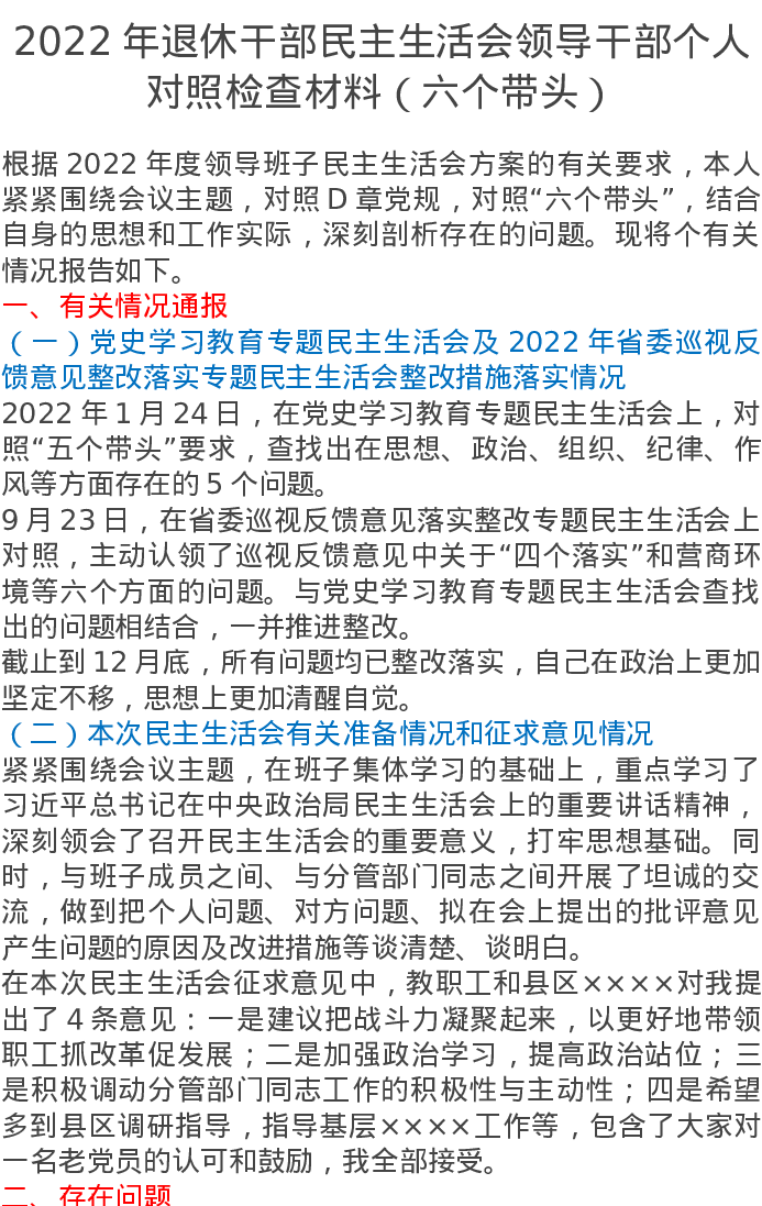 2022年退休干部民主生活会领导干部个人对照检查材料(六个带头)1781字