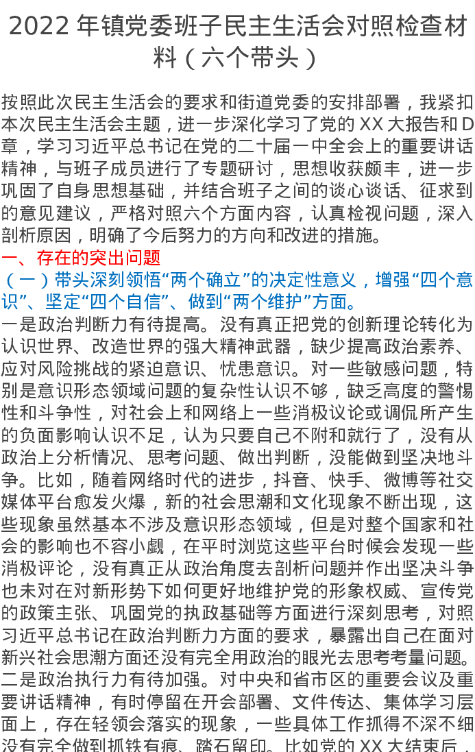 2022年镇党委班子民主生活会对照检查材料(六个带头)
