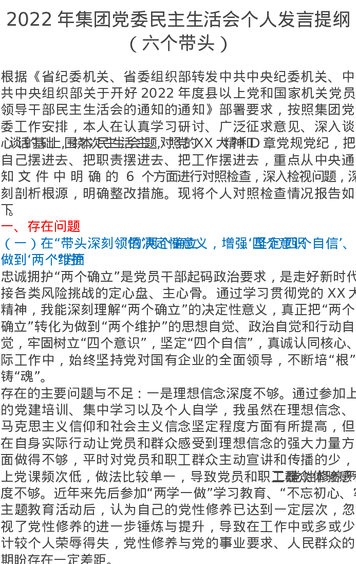 2022年集团党委民主生活会个人发言提纲(六个带头)5855字