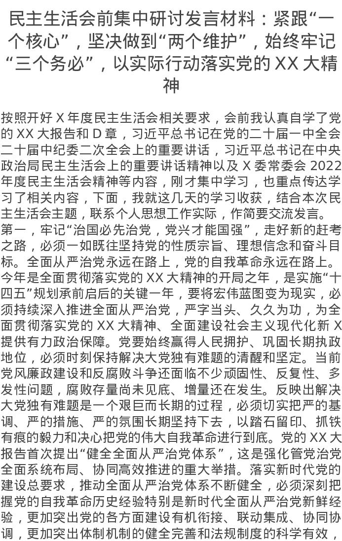 民主生活会前发言材料:紧跟“一个核心”,坚决做到“两个维护”,始终牢记“三个务必”,以实际行动落实党的XX大精神