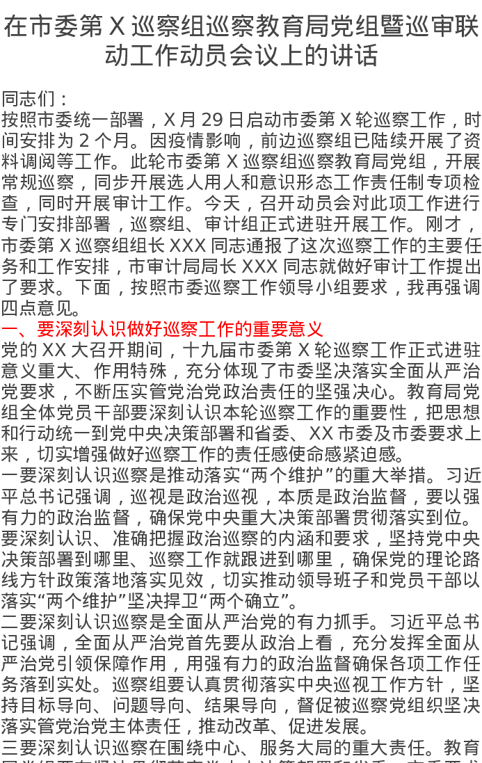 在市委第X巡察组巡察教育局党组暨巡审联动工作动员会议上的讲话