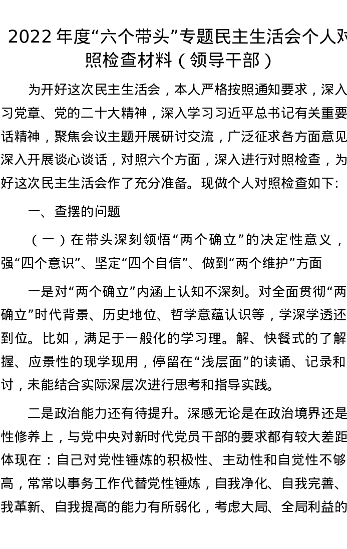 2022年度“六个带头”专题民主生活会个人对照检查材料(领导干部)5112字