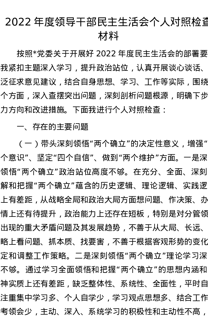 2022年度领导干部民主生活会个人对照检查材料 4590字