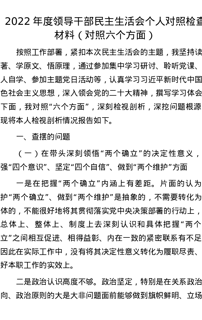2022年度领导干部民主生活会个人对照检查材料(对照六个方面)5823字