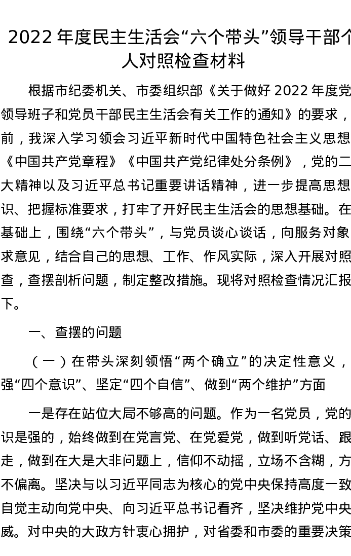 2022年度民主生活会“六个带头”领导干部个人对照检查材料 6329字