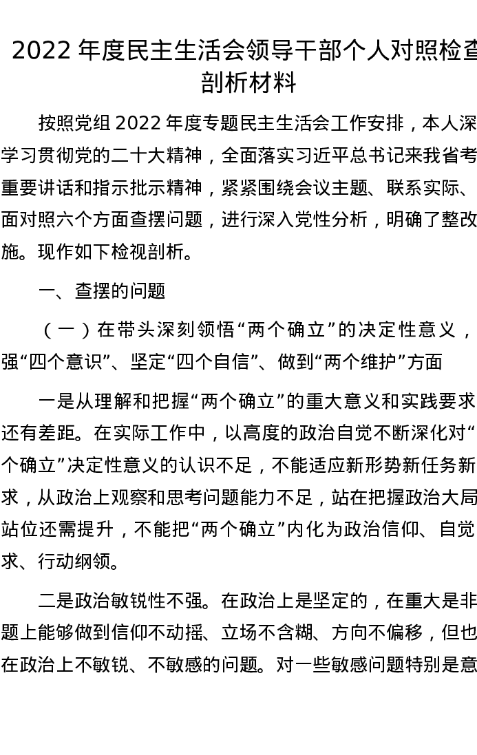 2022年度民主生活会领导干部个人对照检查剖析材料 5005字