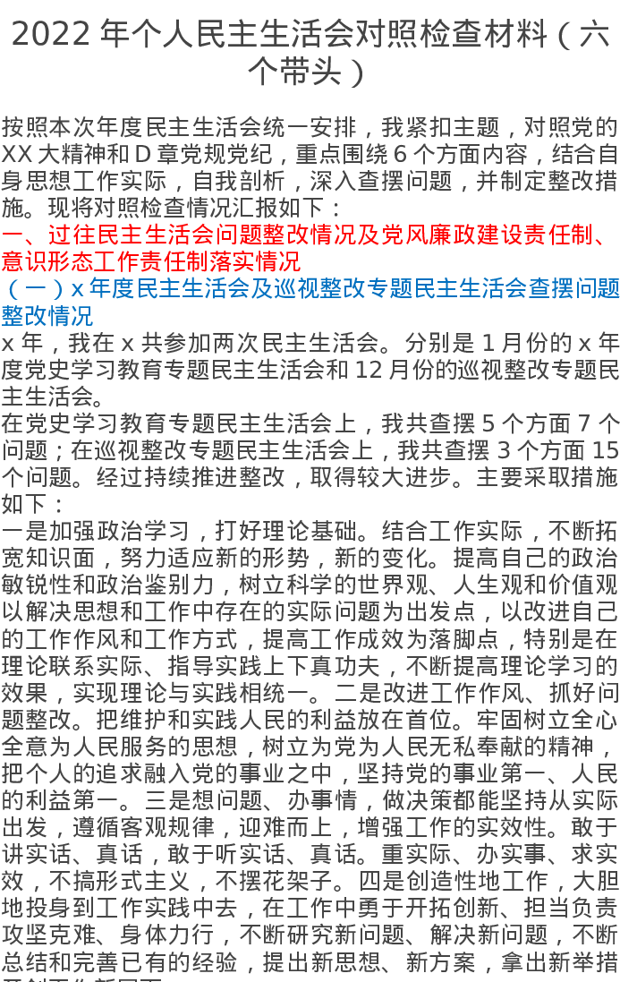 2022年个人民主生活会对照检查材料(六个带头)5327字