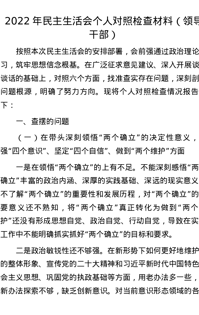 2022年民主生活会个人对照检查材料(领导干部)5795字