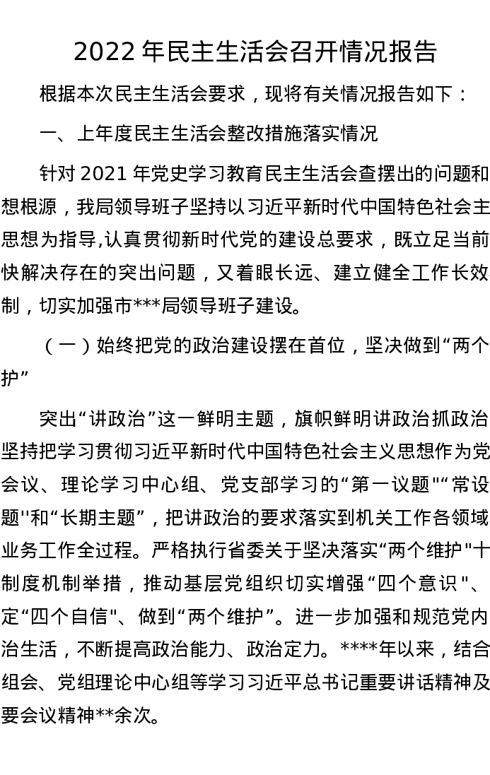 2022年民主生活会召开情况报告 7107字