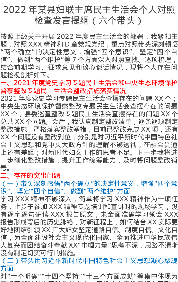 2022年某县妇联主席民主生活会个人对照检查发言提纲(六个带头)3993字