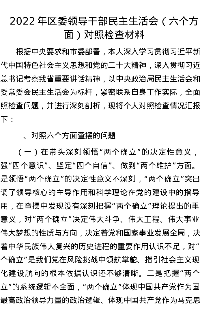 2022年区委领导干部民主生活会(六个方面)对照检查材料 4331字