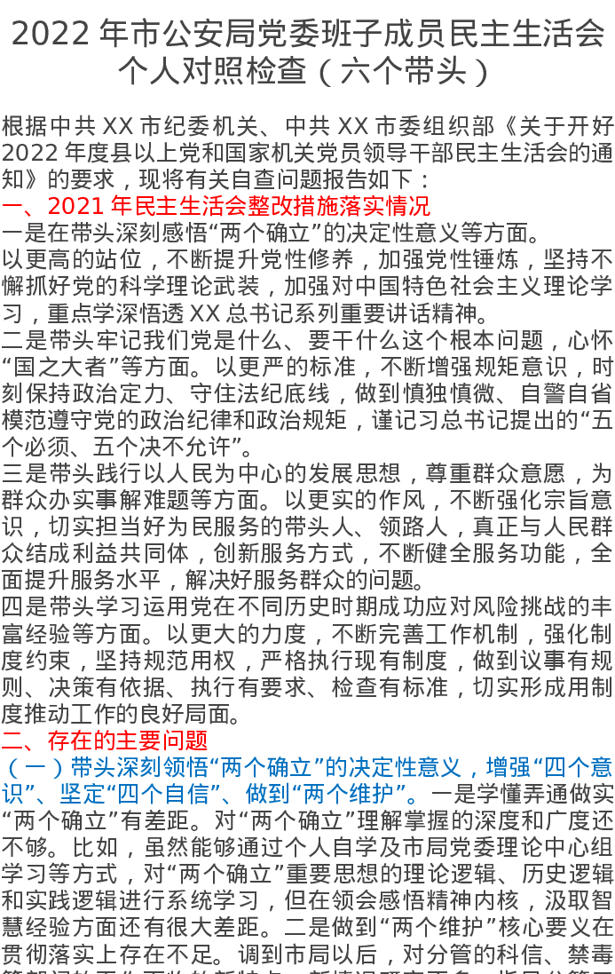 2022年市公安局党委班子成员民主生活会个人对照检查(六个带头)4635字