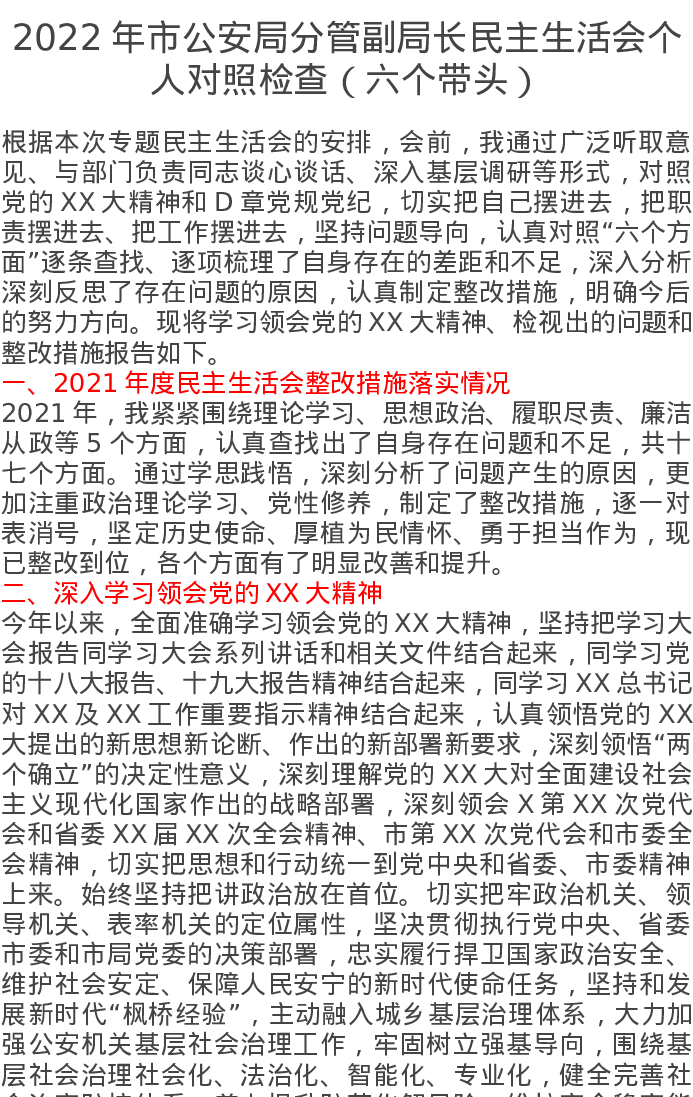 2022年市公安局分管副局长民主生活会个人对照检查(六个带头)5952字