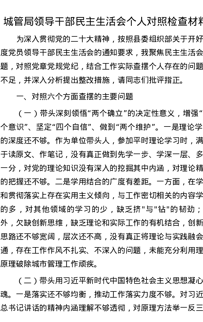 城管局领导干部民主生活会个人对照检查材料 3182字