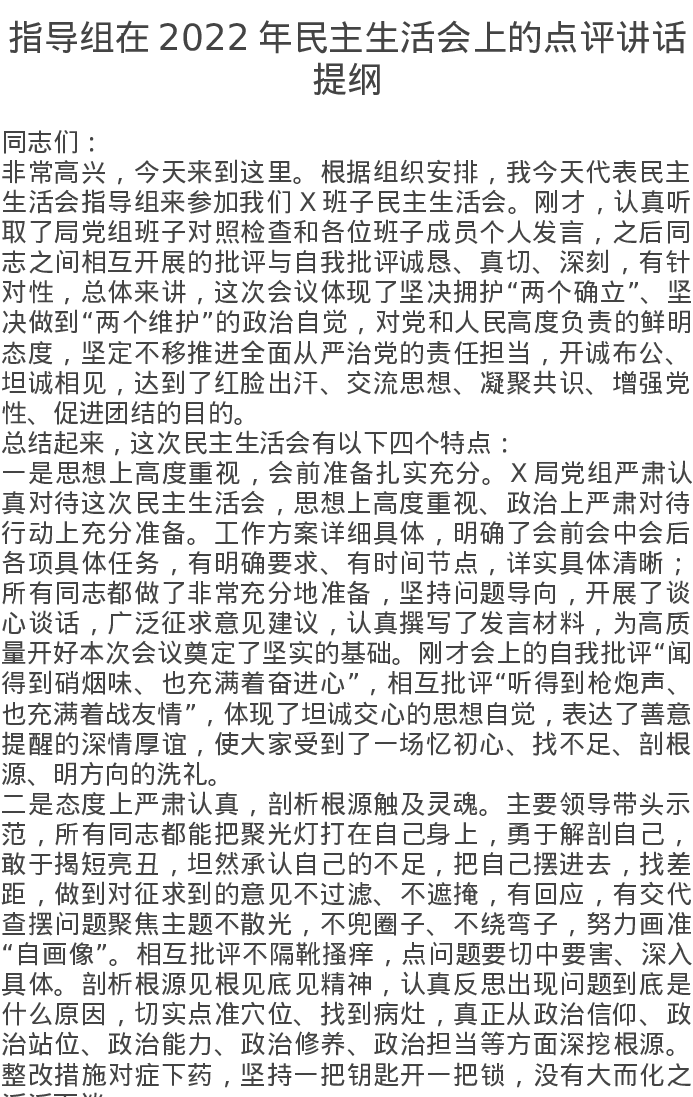 点评讲话:指导组在2022年民主生活会上的点评讲话提纲 2175字
