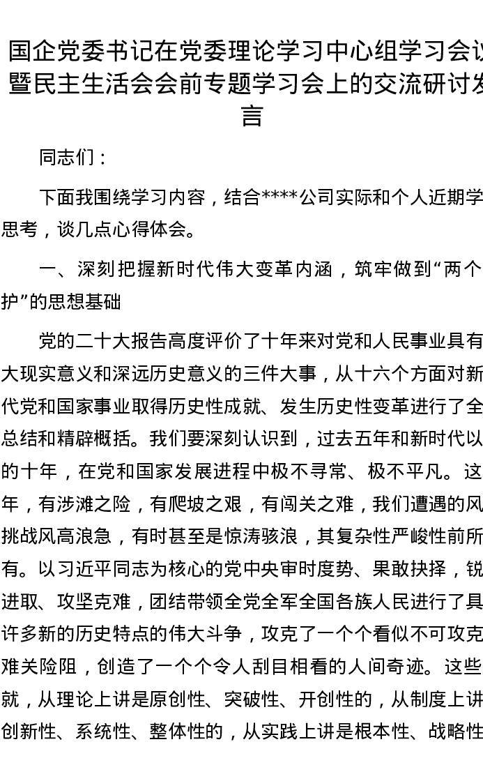 国企党委书记在党委理论学习中心组学习会议暨民主生活会会前专题学习会上的交流研讨发言