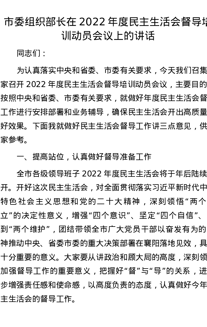 讲话:市委组织部长在2022年度民主生活会督导培训动员会议上的讲话