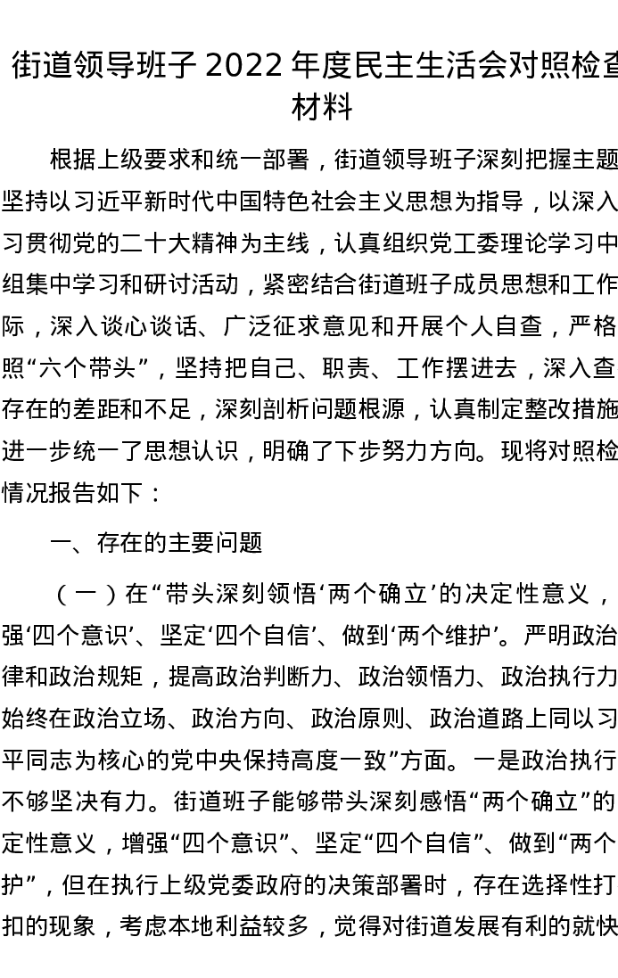 街道领导班子2022年度民主生活会对照检查材料 5436字