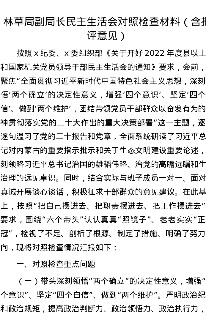 林草局副局长民主生活会对照检查材料(含批评意见)