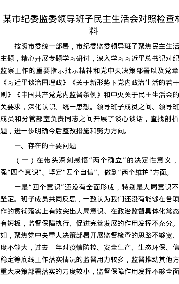 某市纪委监委领导班子民主生活会对照检查材料 5162字
