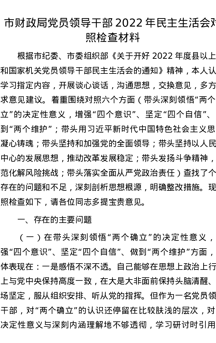 市财政局党员领导干部2022年民主生活会对照检查材料 4200字