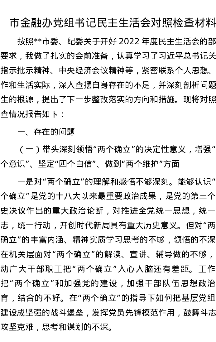 市金融办党组书记民主生活会对照检查材料 5794字