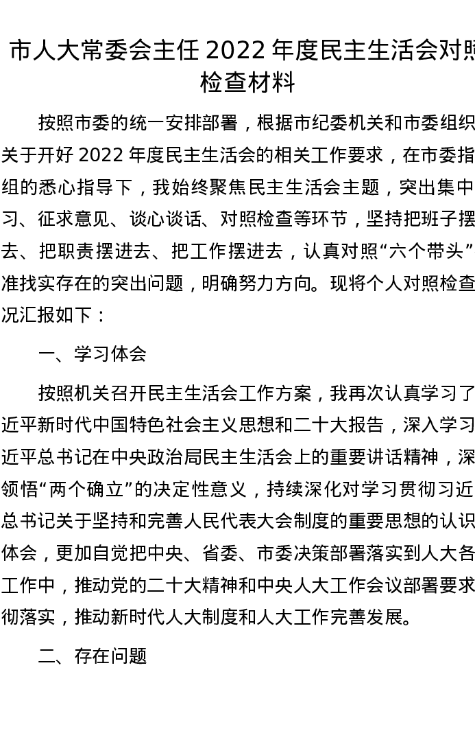 市人大常委会主任2022年度民主生活会对照检查材料 4269字