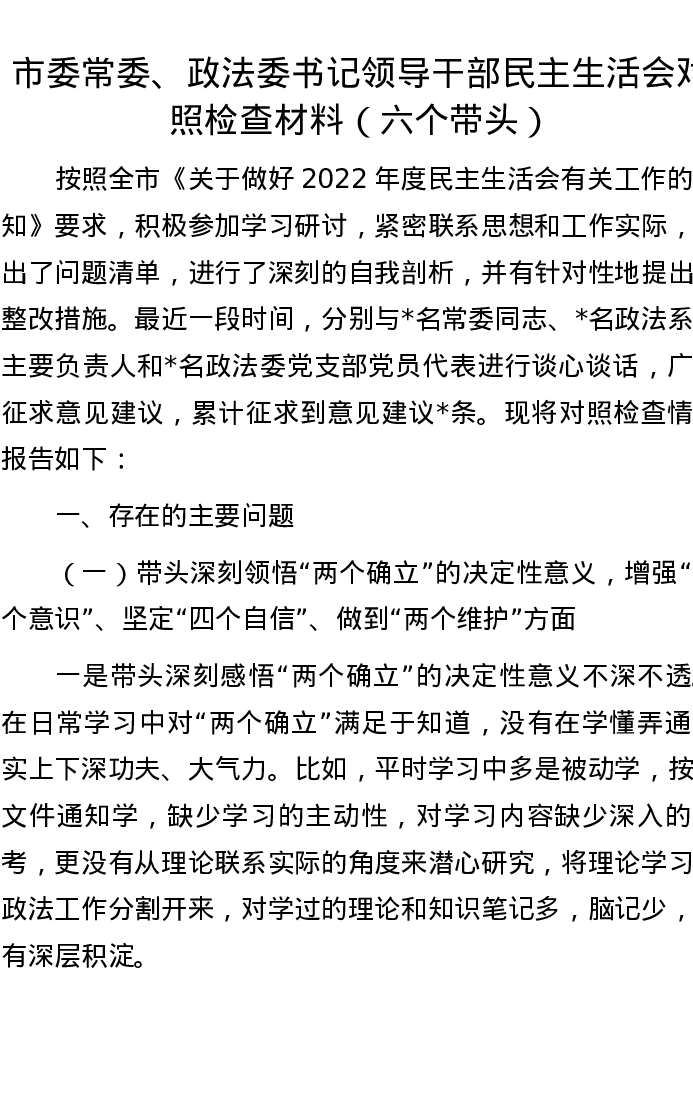 市委常委、政法委书记领导干部民主生活会对照检查材料(六个带头)5237字