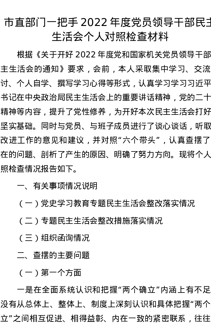 市直部门一把手2022年度党员领导干部民主生活会个人对照检查材料 6227字