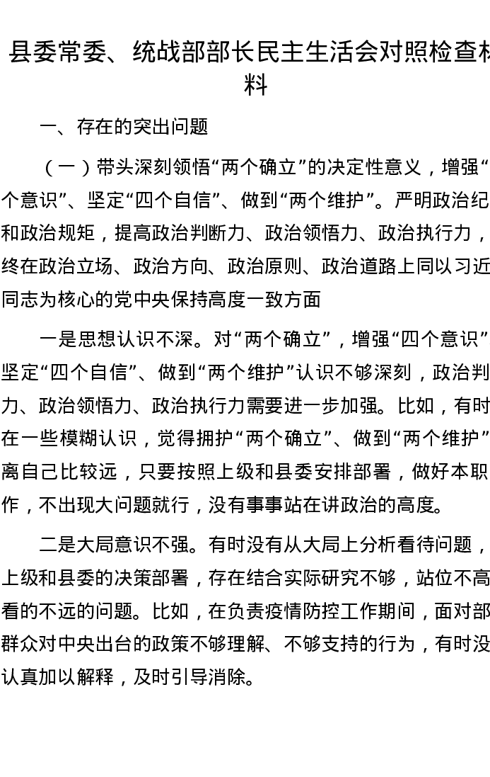 县委常委、统战部部长民主生活会对照检查材料 5021字